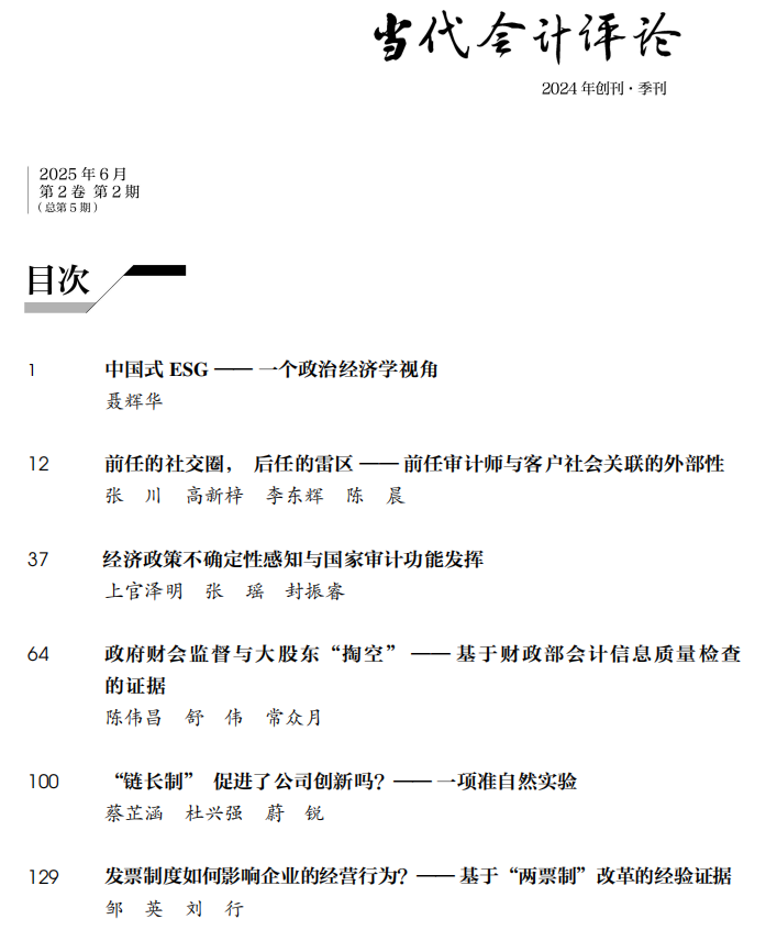 | 政府财会监督与大股东“掏空”——基于财政部会计信息质量检查的证据 | 陈伟昌 舒伟 常众月 | 64-99 |