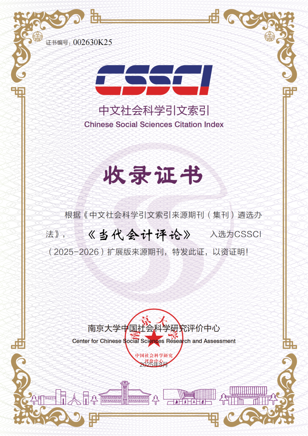 近日,根据《中文社会科学引文索引来源期刊(集刊)遴选办法》,《当代会计评论》入选为中文社会科学引文索引(CSSCI)(2025-2026)扩展版来源期刊,标志着其学术影响力与认可度再获提升。